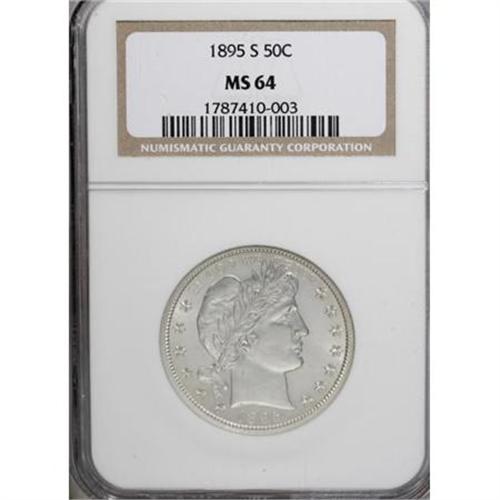 <B>1895-S 50C MS64 NGC.</B></I> An untoned, satiny example with nicely struck design features. The only marks worth mentioning are some vertical slide marks on Liberty's neck, which undoubtedly account for the grade. A few spindly die cracks can be seen on the reverse under magnification. An attractive, near-Gem example. Census: 13 in 64, 10 finer (3/08).<BR><BR><B>Coin Engraver:</B> Charles E. Barber<BR><BR><b>Shipping:</b> Coins & Currency (<a target="_blank" href="http://www.heritageauctions.com/common/shipping.php">view shipping information</a>)