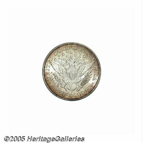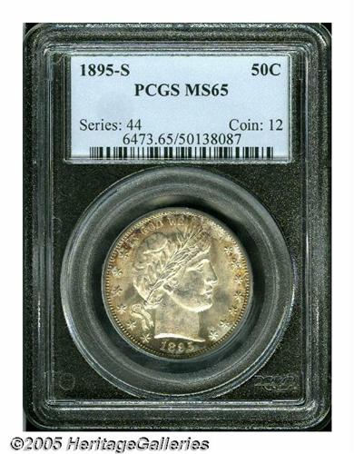 <B>1895-S<50C> MS65 PCGS.</B></I> With a limited original mintage of 1.1 million pieces and an undoubtedly high rate of circulation, the 1895-S is an elusive issue in all grades. Even well worn survivors are difficult to come by, and considerable patience is usually required to obtain an AU or Mint State example. The coin offered here exhibits radiant luster and wisps of russet and violet patina around the peripheries. All of the design elements are well brought up. A few minute contact marks are noted on the shield and on Liberty's face, including a short pinscratch-like mark on the temple. Population: 8 in 65, 3 finer (6/05).