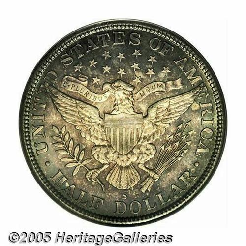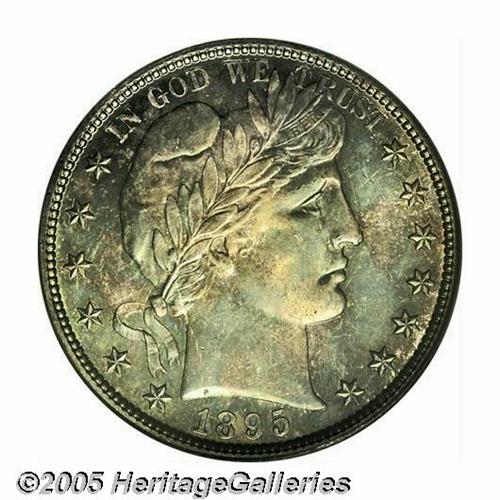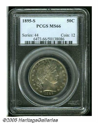 <B>1895-S<50C> MS66 PCGS.</B></I> Moderately toned in swirling rose-gray and steel-blue shades, with underlying surfaces that benefit from blazing cartwheel luster and pinpoint sharpness. A few wispy luster grazes are found almost exclusively on the portrait. Although this issue's Mint State rarity in relation to the original mintage is not as great as some of its contemporaries, their impressive strike and luster qualities make the '95-S very popular with collectors. Gem and better examples are still quite elusive. Population: 1 in 66, 2 finer (5/05).
