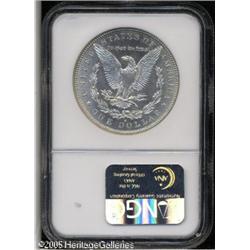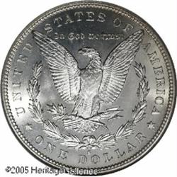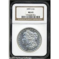 <B>1895-S<img border='0' src='http://www.heritagecoins.com/images/star.gif' width=10 height=10>$1 MS65 NGC.</B></I> Produced in limited numbers (400,000 pieces), the 1895-S dribbled out of the San Francisco Mint through the early 1950s. By this time, however, the rarity of this date was solidified, and not even the ubiquitous Redfield Hoard could increase this issue's Mint State population to a level that would provide all Morgan Dollar collectors with a representative. One of only 29 MS65 examples known to the two major grading services (1/05), this untoned Gem combines richly frosted devices and more thinly veiled fields. The latter display scattered die striations, a characteristic feature of many Mint State '95-S Dollars. Both the strike and the surface preservation are free of criticism. A solidly graded Gem example. Population: 7 in 65, 3 finer (1/05).<BR><I>From The Banks Collection.</B></I> Lot:10480