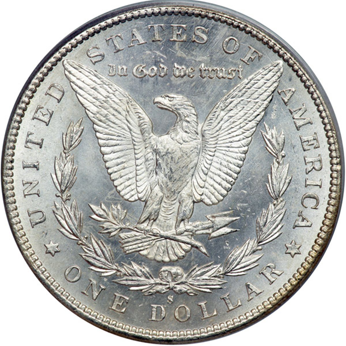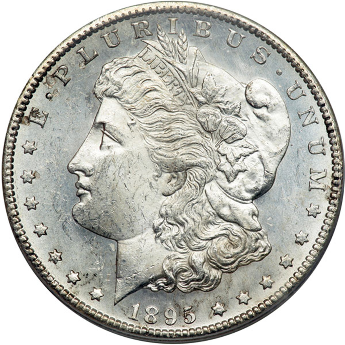 1895-S Morgan Dollar. PCGS graded MS-62. Frosty mostly untoned. A lustrous Morgan with few abrasions on the face of Liberty on the obverse. The obverse has very sharp detail in the eagle's chest and wings and is relatively free of abrasions. Scarce (PCGS # 7238) .