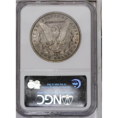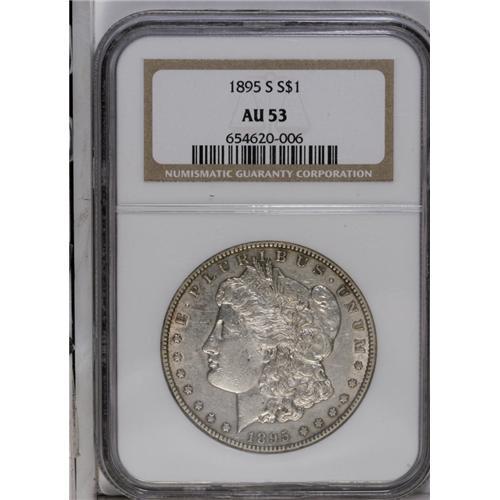 <B>1895-S<img border='0' src='http://www.heritagecoins.com/images/star.gif' width=10 height=10>$1> AU53 NGC.</B></I> The legends and devices have much of their original luster. The surfaces are moderately abraded for the grade, and there is only a hint of rub on the highpoints. Mauve on the obverse turns to a deeper violet-gray on the reverse, with golden accents near the peripheries.