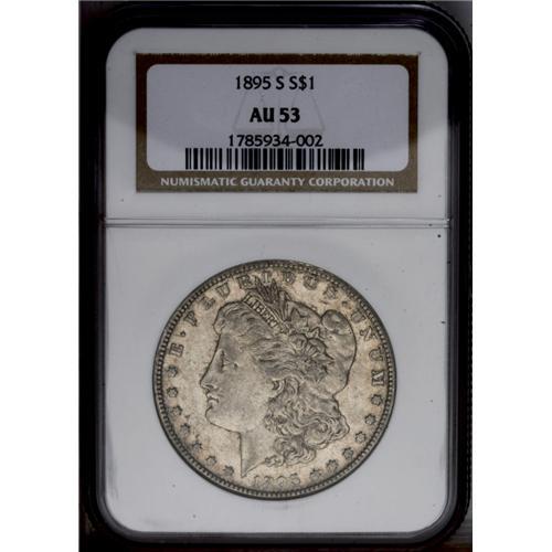 <B>1895-S<img border='0' src='http://www.heritagecoins.com/images/star.gif' width=10 height=10>$1> AU53 NGC.</B></I> This lightly circulated semi-key date is toned in light gray and orange-beige color, which is a shade or two deeper on the reverse. Nice definition is apparent on the design elements, save for the hair over Liberty's ear. A few minute marks are seen on the obverse. <BR><BR><B>Important notice:</B> Heritage usually auctions material at the rate of 200-250 lots per hour. On some occasions eBay Live bid software or the Internet may not be able to keep up with the pace of the auction. We recommend placing a realistic absentee bid now as insurance to avoid disappointment. Occasionally the auctioneer may eliminate or reject an eBay Live bid, and the auctioneer may also reopen a lot after the close of the eBay live bidding (usually because we missed an audience bid), and may reject your bid even if it shows you as the winning bidder. By bidding via eBay Live, you agree that Heritage may award the lot to another bidder at its sole discretion under the circumstances described above or any other reasonable circumstances. Since eBay bids are not shown to us until we open the lot on the floor, we treat those bids just like floor bids. In most cases the floor responds before the eBay bid is presented to us, due to Internet lag time, so for consistency we have made it a policy that floor bids are always considered first over tie eBay live bids. Also please note that all Heritage lots purchased through eBay Live carry a 20% Buyer's Premium. Please make sure you read the Terms and Conditions before you bid. This lot is being auctioned in conjunction with a live floor auction by Heritage Galleries & Auctioneers. All final auction and invoice information will be supplied by Heritage Galleries & Auctioneers, and all other information should be considered preliminary. Lot:3694 <BR><BR><B>Winning Notification and Billing:</B> After the FINAL session in this auction is complete, Heritage will send e-mail and snail mail invoices. This process normally takes several days. All final auction and invoice information will be supplied by Heritage Galleries & Auctioneers, and all other information should be considered preliminary. <BR><BR>This auction will be conducted on a live auction floor and over the Internet through eBay Live. If you choose to place an absentee bid, please take a moment to <font color='#0000ff'><u><a href='http://pages.ebay.com/liveauctions/help/before/laabsentee.html'>learn how eBay Live absentee bidding works</a></u></font><font color='#000000'>