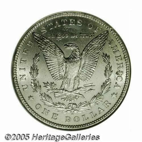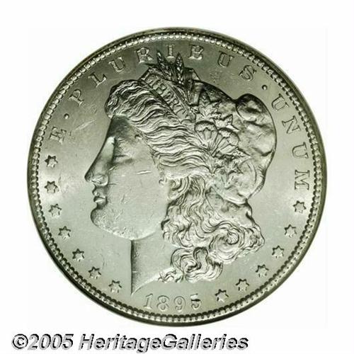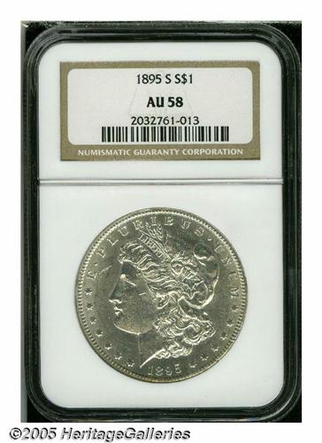 <B>1895-S<S$1> AU58 NGC.</B></I> Essentially brilliant and very satiny. The luster is flashy, but broken in the exposed fields. A nicely struck Morgan Dollar that has a few abrasions on Liberty's cheek. Still, a coveted low mintage issue.