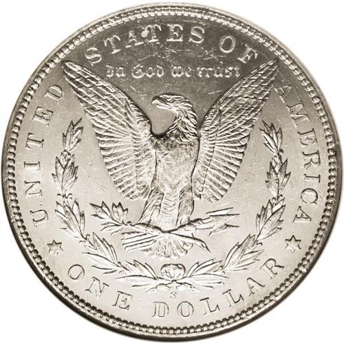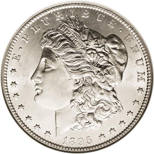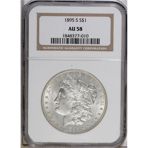 <B>1895-S<img border='0' src='http://www.heritagecoins.com/images/star.gif' width=10 height=10>$1> AU58 NGC.</B></I> This low mintage issue comes under extra market pressure due to the absence of P-mint examples for the year, combined with the scarcity of the only other available issue, the 1895-O. This piece is boldly struck, brilliant, and shows a few noticeable abrasions. The coin seems to be free of wear, however.