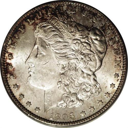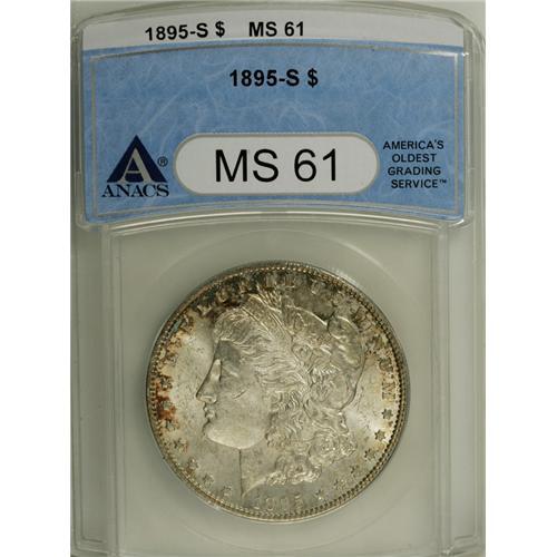 <B>1895-S S$1 MS61 ANACS.</B></I> An attractive example of this popular and conditionally scarce San Francisco date which, like many Uncirculated '95-S Dollars, may have originated from the LaVere Redfield hoard. This piece is moderately toned with shades of amber and gun-metal blue along the peripheries, with slightly weak definition over the central details, and appealing frosty luster. Very scuffy on Liberty's cheek and throat, and in the left obverse field, which limits the grade; the reverse is nearly of Choice status. This issue is scarce in all Mint State grades.<BR><BR><b>Shipping:</b> Coin/Currency (<a target="_blank" href="http://www.heritageauctions.com/common/shipping.php">view shipping information</a>)