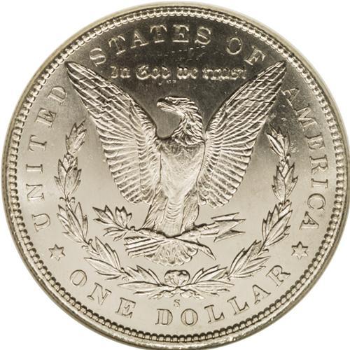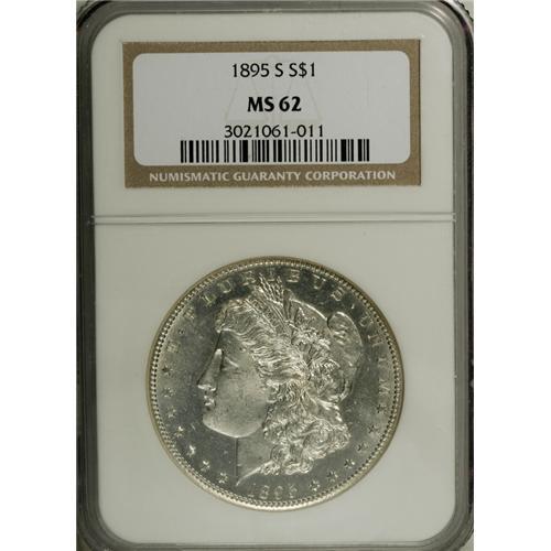 <B>1895-S S$1 MS62 NGC.</B></I> A well struck and important Mint State example of this often-tricky issue. The Morgan dollars of 1895 are all difficult to acquire in attractive, unworn condition, and San Francisco examples often come with dull and unattractive luster. The shining surfaces of this brilliant representative are an exception to the rule, and even though a number of light abrasions pepper each side, the eye appeal is strong.<BR><BR><b>Shipping:</b> Coin/Currency (<a target="_blank" href="http://www.heritageauctions.com/common/shipping.php">view shipping information</a>)