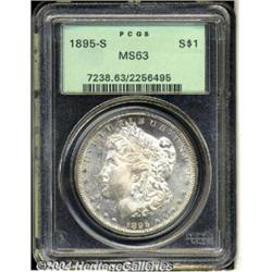 <B>1895-S<S$1> MS63 PCGS.</B></I> Blushes of peach patina encroach upon the centers of this lightly toned example. A nicely struck and semi-prooflike piece with good eye appeal due to the absence of notable bagmarks. Among the Morgan Dollar issues of the San Francisco Mint, only the famous 1893-S has a lower mintage. Certified in a prior generation PCGS holder. <BR><BR><B>Important notice:</B> Heritage usually auctions material at the rate of 200-250 lots per hour. On some occasions eBay Live bid software or the Internet may not be able to keep up with the pace of the auction. We recommend placing a realistic absentee bid now as insurance to avoid disappointment. Occasionally the auctioneer may eliminate or reject an eBay Live bid, and the auctioneer may also reopen a lot after the close of the eBay live bidding (usually because we missed an audience bid), and may reject your bid even if it shows you as the winning bidder. By bidding via eBay Live, you agree that Heritage may award the lot to another bidder at its sole discretion under the circumstances described above or any other reasonable circumstances. Since eBay bids are not shown to us until we open the lot on the floor, we treat those bids just like floor bids. In most cases the floor responds before the eBay bid is presented to us, due to Internet lag time, so for consistency we have made it a policy that floor bids are always considered first over tie eBay live bids. Also please note that all Heritage lots purchased through eBay Live carry a 20% Buyer's Premium. Please make sure you read the Terms and Conditions before you bid. </span></font></tr></table></td></tr></table>