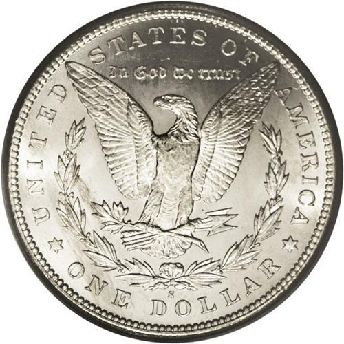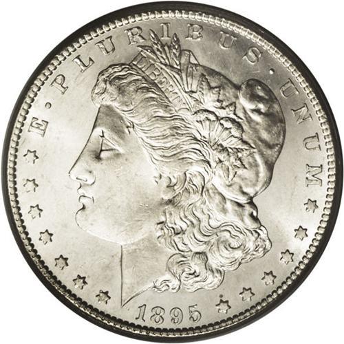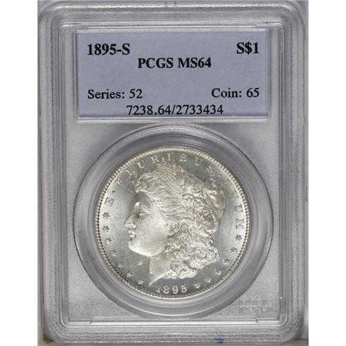 <B>1895-S<img border='0' src='http://www.heritagecoins.com/images/star.gif' width=10 height=10>$1> MS64 PCGS.</B></I> A high grade example of this rare and important semi-key dollar. The fields have innumerable faint die striations which are responsible for imparting a semi-prooflike appearance to the coin with mildly contrasting, frosted devices. Lacking a complete strike over the ear of Liberty, the obverse has just enough small abrasions to keep this otherwise Gem coin from an MS65 grade. A couple of minor mint-made grease stains are mentioned to the left of the eagle on the reverse.<BR><I>From The Chicago-Ark Collection.</B></I>