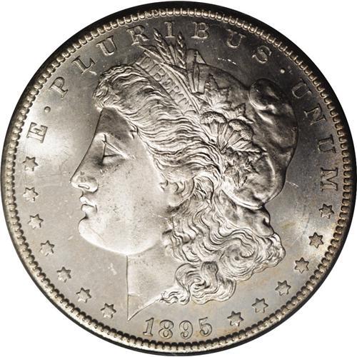 <B>1895-S<img border='0' src='http://www.heritagecoins.com/images/star.gif' width=10 height=10>$1 MS64 PCGS.</B></I> Of the three mints that struck dollars in 1895, the 1895-S is the most "common." It is, of course, not common at all, but only when compared to the proof-only 1895 and the very rare 1895-O. Probably the largest accumulation of the 1895-S was from the estate of LaVere Redfield, who may have had as many as 1,000 pieces. Most of the Redfield '95-S dollars we have seen are lower-end Uncs with numerous abrasions. This piece is either one of the finest of Redfield's holdings or (more likely) not from his estate. The surfaces have the usual bright, coruscating mint luster with flashy, semi-prooflike fields. Sharply struck, there is a light overlay of ice-blue patina over each side with occasional light dabs of pale rose-golden coloration.<BR><I>From The Leslie E. Lunsford Collection, #7 Current Finest Registry Morgan Dollars Basic Set, Circulation Strikes.</B></I>
