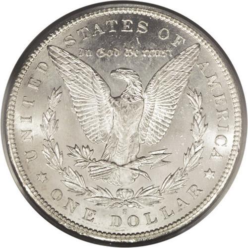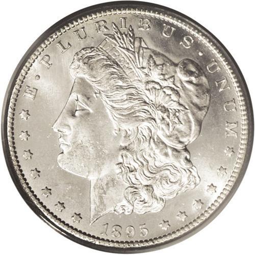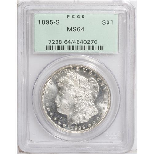 <B>1895-S<img border='0' src='http://www.heritagecoins.com/images/star.gif' width=10 height=10>$1> MS64 PCGS.</B></I> The 1895-S is a scarce and highly respected issue from the mid-1890s. Only 400,000 pieces were struck, and just a few bags were released by the San Francisco Mint. The best-known hoard was a bag that was a part of LaVere Redfield's extensive holdings of silver dollars. However, most of Redfield's coins are typical of what is normally seen of this issue: numerous and heavy abrasions. This piece is atypically clean with only the smallest marks on each side. As such, this should be a coin of considerable interest to a number of advanced Morgan dollar specialists. Brilliant throughout, the fields are semi-prooflike and the striking definition is strong but not quite fully detailed. Simply outstanding quality with eye appeal that would be hard to duplicate at the MS65 level.