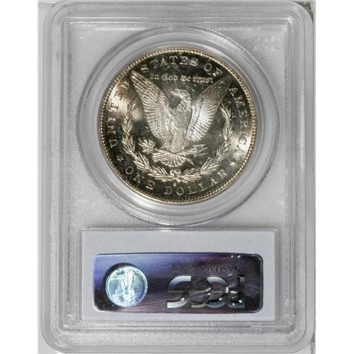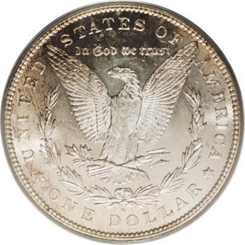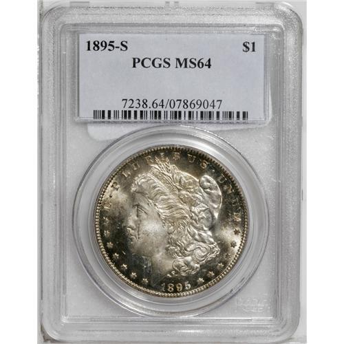 <B>1895-S<img border='0' src='http://www.heritagecoins.com/images/star.gif' width=10 height=10>$1> MS64 PCGS.</B></I> This Choice Mint State example is an attractive specimen with lustrous silver surfaces accented by traces of pale golden-brown and iridescent toning. Both sides have considerable reflectivity in the fields with light cameo contrast. This is a scarce date but it is the only easily obtainable Mint State dollar of the year.