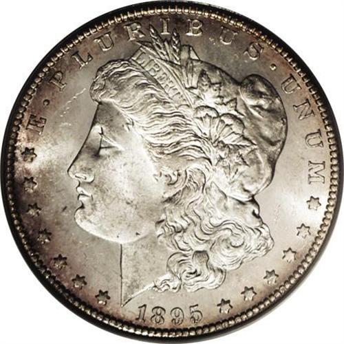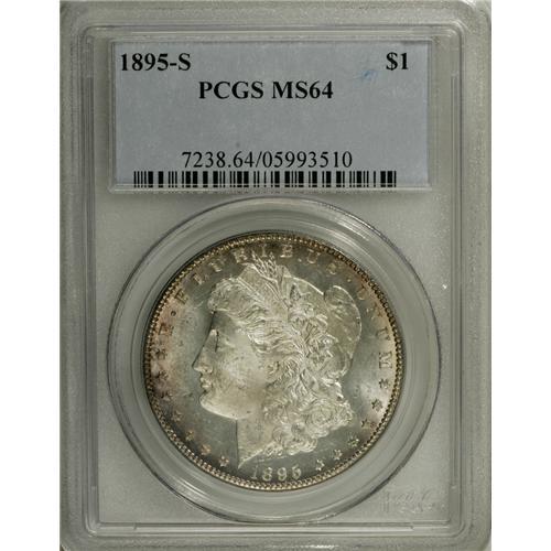 <B>1895-S S$1 MS64 PCGS.</B></I> This Choice Mint State example is an attractive specimen with lustrous silver surfaces accented by traces of pale golden-brown and iridescent toning. Both sides have considerable reflectivity in the fields with light cameo contrast. This is a scarce date but it is the most easily obtainable Mint State dollar of the year.<BR><BR><b>Shipping:</b> Coin/Currency (<a target="_blank" href="http://www.heritageauctions.com/common/shipping.php">view shipping information</a>)