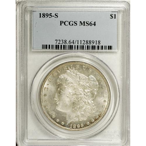 <B>1895-S S$1 MS64 PCGS.</B></I> This better date near-Gem has flashy semi-prooflike fields. Dashes of orange-gold patina cling to the borders, while the interiors are nearly untoned. The strike is above average, and no marks require individual description. The overall look is attractive.<BR><BR><b>Shipping:</b> Coins & Currency (<a target="_blank" href="http://www.heritageauctions.com/common/shipping.php">view shipping information</a>)