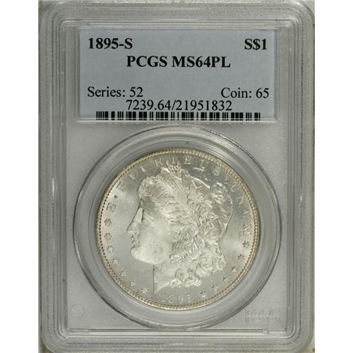 <B>1895-S S$1 MS64 Prooflike PCGS.</B></I> Produced in limited numbers, the key 1895-S is a significant rarity in all Mint State grades. This near-Gem example exhibits frosted devices and mirror-like fields. A brilliant piece with virtually no toning. This coin has a few scattered abrasions mentioned only for the sake of accuracy. The opportunity to acquire a rare date in a rare grade. Population: 16 in 64, 1 finer (12/06).<BR><BR><b>Shipping:</b> Coin/Currency (<a target="_blank" href="http://www.heritageauctions.com/common/shipping.php">view shipping information</a>)