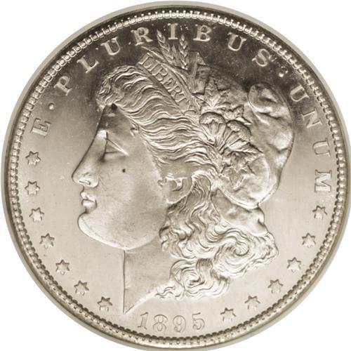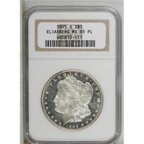 <B>1895-S<img border='0' src='http://www.heritagecoins.com/images/star.gif' width=10 height=10>$1> MS65 Prooflike NGC.</B></I> Ex: Eliasberg. As is the case for all 1895-dated silver dollars, the 1895-S is rare in Mint State. The Sherman Act, which obligated the Mint to coin millions of silver dollars, was repealed on Nov. 2, 1893. Since Treasury vaults were packed with Morgan dollars, mintages dropped substantially until 1896. The 1895-S had a mintage of only 400,000 pieces, most of which went into local circulation. PCGS has certified examples in every grade down to Poor 1. Among Mint State survivors, Prooflikes are in the minority, and Deep Mirror Prooflikes are very rare. The present brilliant and exemplary piece has prominently mirrored fields that border on DMPL status. Frosty devices exhibit obvious contrast. Since the surfaces are well preserved, perhaps only slight softness of strike in the centers and a pair of tiny dark spots on the portrait prevent an even higher grade.<BR><I>Ex: J.M. Clapp, purchased directly from the San Francisco Mint; John H. Clapp; Louis E. Eliasberg, Sr. Collection (Bowers and Merena, 4/97); New York ANA Signature, (Heritage, 7/97), lot 7082.</B></I>