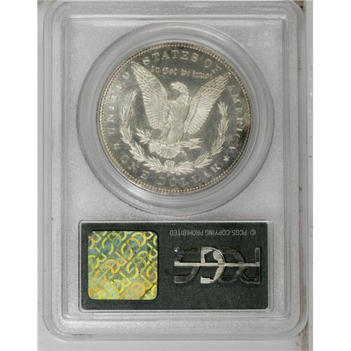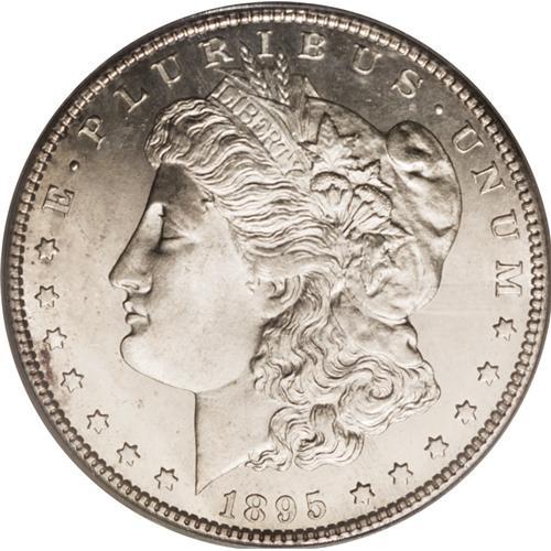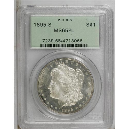 <B>1895-S<img border='0' src='http://www.heritagecoins.com/images/star.gif' width=10 height=10>$1> MS65 Prooflike PCGS.</B></I> VAM-4. A Top 100 Variety. The S over Horizontal S variety. This impressive Gem offers slight Cameo frost on the devices, and the glassy fields exhibit pleasing reflectivity. Light gray-gold toning is consistent save for a blush of navy-blue and russet at 3 o'clock on the reverse. The preservation is exemplary for the MS65 level, and only moderate mint-made roller marks in Liberty's hair deny a higher numerical assessment. The present Gem is the single finest PCGS-certified Prooflike, but accuracy compels us to note that while no Deep Mirror Prooflikes have been certified as MS65 by either NGC or PCGS (9/06), the latter service has encapsulated two pieces as MS66 DMPL and another as MS67 DMPL. However, if any of those three pieces were to again appear on the market, they would likely command a price above $100,000. The significance of the current opportunity is uncontestable.