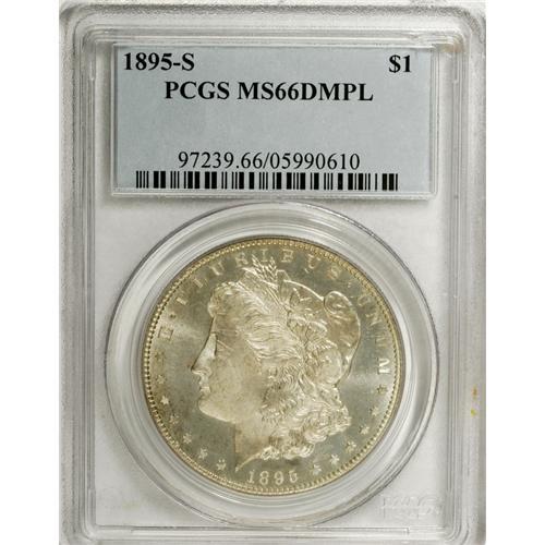 <B>1895-S S$1 MS66 Deep Mirror Prooflike PCGS.</B></I> An extraordinary example and one of the finest existing 1895-S Morgan silver dollars, as just one higher grade piece has been certified by PCGS. A single MS67 DMPL piece holds top honors as the only Superb Gem Morgan dollar of this date, regardless of designation. This MS66 DMPL coin is tied with one other coin for second best among coins certified by PCGS. Both sides of this piece are fully struck with deeply mirrored fields, highly lustrous devices, and exceptional cameo contrast. The surfaces are brilliant with subtle champagne toning that is hardly visible.<BR> While prooflike examples are not rarities in lower grades, they are exceedingly rare in Gem quality. In the past, it was hard for dealers and auctioneers to avoid temptation. Examples of this quality were sometimes called branch mint proofs. The depth of the mirrors fall just short of proof quality, although it is not hard to understand such descriptions.<BR> This date is the least rare of the 1895 Morgan dollars in higher grades, the Philadelphia Mint pieces being only known in proof format, and the New Orleans Mint pieces being condition rarities in all Mint State grades, but common enough if well circulated. This important 1895-S Morgan dollar should see considerable competition on the auction floor, as Set Registry collectors and other specialists take advantage of a remarkable opportunity. Population: 2 in 66, 1 finer (11/06).<BR><BR><b>Shipping:</b> Coin/Currency (<a target="_blank" href="http://www.heritageauctions.com/common/shipping.php">view shipping information</a>)