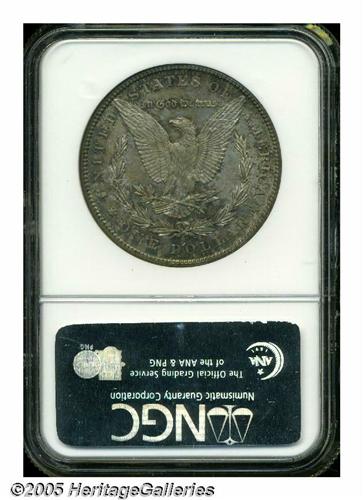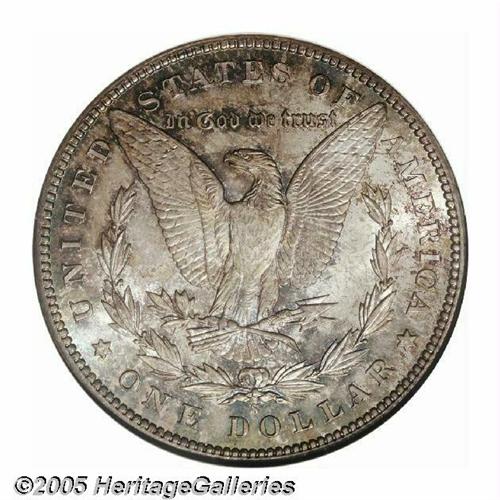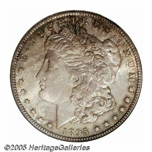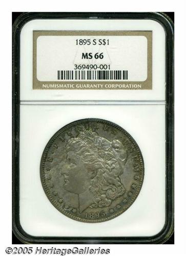 <B>1895-S<S$1> MS66 NGC.</B></I> Struck in the final year of a brief political climate that drastically reduced the production of Morgan Dollars, the 1895-S is an issue that can be difficult to locate in all but the most heavily worn grades. Most Mint State '95-S Dollars available today originated from the Redfield hoard, which held about 1,000 pieces of generally well abraded examples of this difficult and popular issue. This comparatively small quantity of Uncirculated pieces tends to grade MS 63 at best, most often a point or two less, and Premium Gem examples such as this one are virtually unheard of quality.<BR> Both sides of this impeccable, wholly original representative are typically well defined and are layered in mottled lilac-gray, coppery-gold, and steel-blue shades. As one might expect from its outstanding grade, there are few surface marks of any consequence beneath the toning. A shallow blemish on Liberty's brow only shows up under close scrutiny and is only being mentioned because of the scarcity of marks. Population: 3 in 66, 0 finer (5/05).