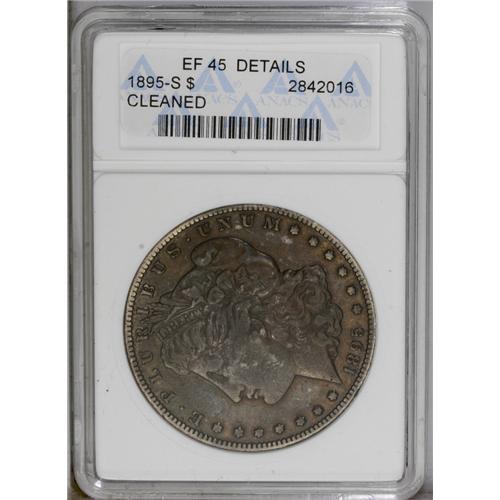 <B>1895-S<img border='0' src='http://www.heritagecoins.com/images/star.gif' width=10 height=10>$1>--Cleaned--ANACS. XF45 Details.</B></I> Both sides are dominated with deep steel-gray color. Some multicolored iridescence is noted at certain angles on the obverse. The second lowest mintage San Francisco Mint issue. <BR><BR><B>Important notice:</B> Heritage usually auctions material at the rate of 200-250 lots per hour. On some occasions eBay Live bid software or the Internet may not be able to keep up with the pace of the auction. We recommend placing a realistic absentee bid now as insurance to avoid disappointment. Occasionally the auctioneer may eliminate or reject an eBay Live bid, and the auctioneer may also reopen a lot after the close of the eBay live bidding (usually because we missed an audience bid), and may reject your bid even if it shows you as the winning bidder. By bidding via eBay Live, you agree that Heritage may award the lot to another bidder at its sole discretion under the circumstances described above or any other reasonable circumstances. Since eBay bids are not shown to us until we open the lot on the floor, we treat those bids just like floor bids. In most cases the floor responds before the eBay bid is presented to us, due to Internet lag time, so for consistency we have made it a policy that floor bids are always considered first over tie eBay live bids. Also please note that all Heritage lots purchased through eBay Live carry a 20% Buyer's Premium. Please make sure you read the Terms and Conditions before you bid. This lot is being auctioned in conjunction with a live floor auction by Heritage Galleries & Auctioneers. All final auction and invoice information will be supplied by Heritage Galleries & Auctioneers, and all other information should be considered preliminary. Lot:3692 <BR><BR><B>Winning Notification and Billing:</B> After the FINAL session in this auction is complete, Heritage will send e-mail and snail mail invoices. This process normally takes several days. All final auction and invoice information will be supplied by Heritage Galleries & Auctioneers, and all other information should be considered preliminary. <BR><BR>This auction will be conducted on a live auction floor and over the Internet through eBay Live. If you choose to place an absentee bid, please take a moment to <font color='#0000ff'><u><a href='http://pages.ebay.com/liveauctions/help/before/laabsentee.html'>learn how eBay Live absentee bidding works</a></u></font><font color='#000000'>