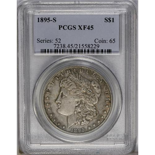 <B>1895-S<img border='0' src='http://www.heritagecoins.com/images/star.gif' width=10 height=10>$1> XF45 PCGS.</B></I> VAM-3. Though not a Top 100 variety, this repunched mintmark is popular among Morgan dollar collectors and shows clearly. Traces of luster appear in the protected areas of this evenly worn and slate-gray piece.