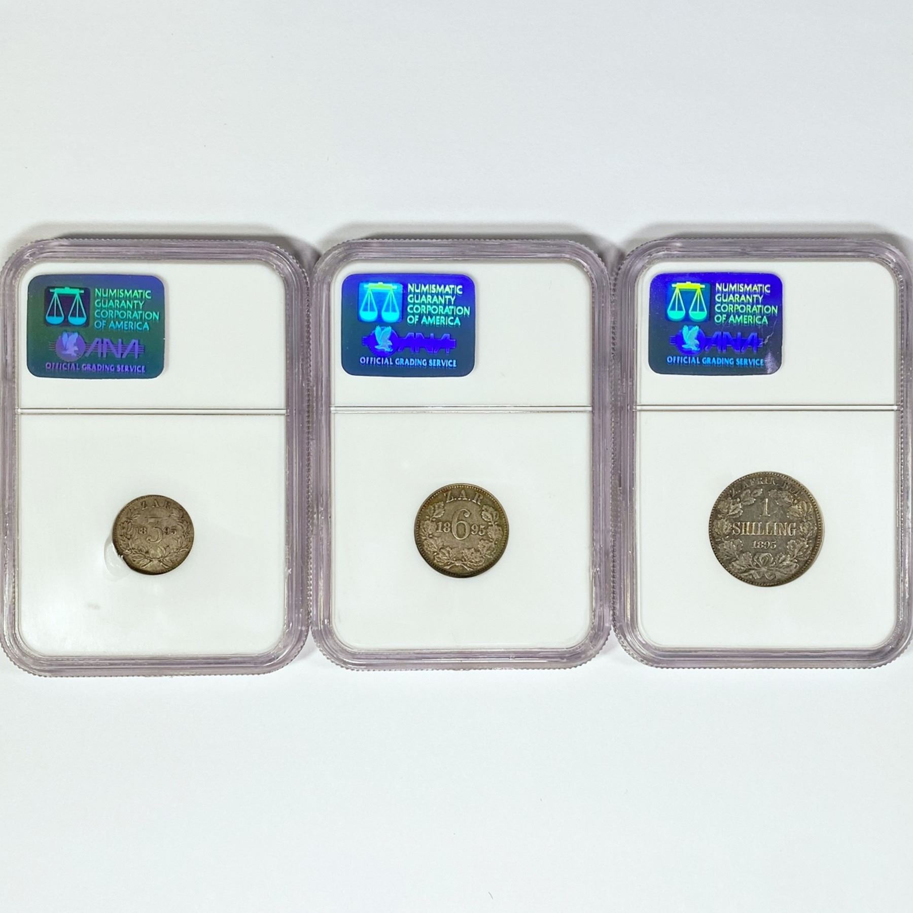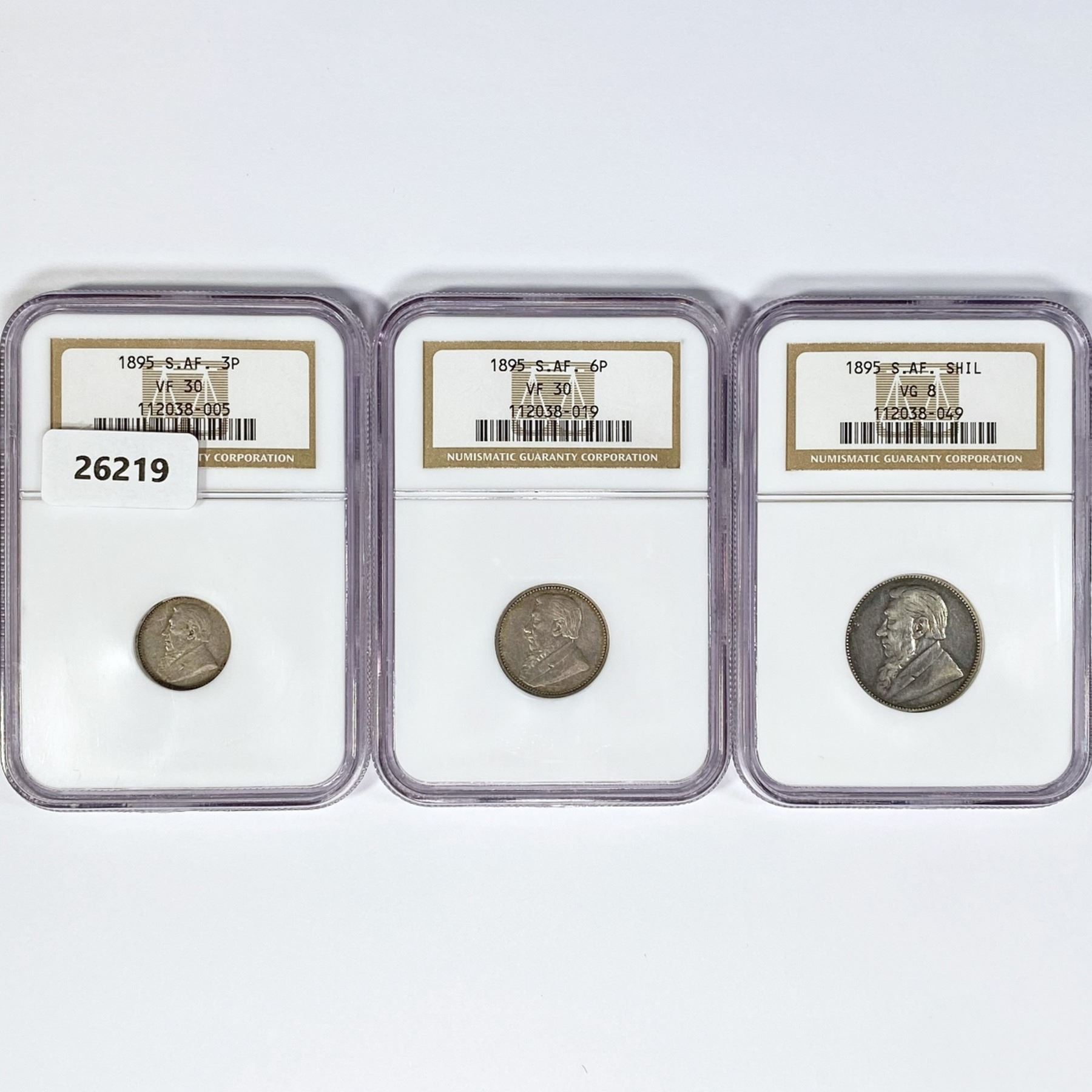 1895 Set (3) Silver 3P, 6P, 1 Shil. S. AF. NGC
