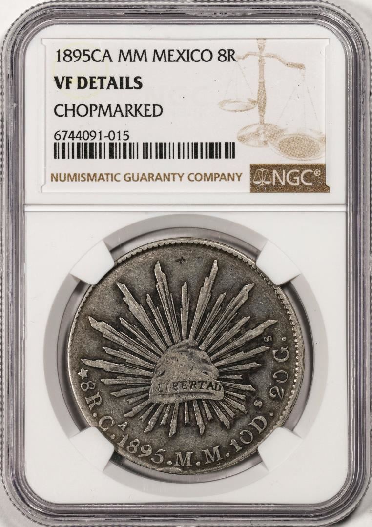 One 1895CA MM Mexico 8 Reales Silver Coin NGC VF Details Chopmarked. NGC Certified.