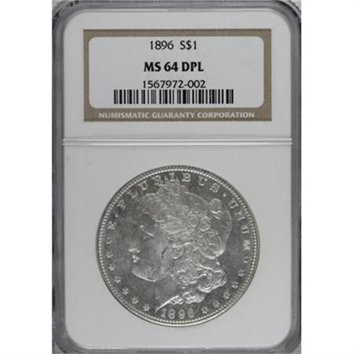 <B>1896 $1 MS64 Deep Mirror Prooflike NGC.</B></I> NGC Census: (181/53). PCGS Population (225/139). Numismedia Wsl. Price for NGC/PCGS coin in MS64: $280. (#97241)<BR><BR><b>Shipping:</b> Coins & Currency (<a target="_blank" href="http://www.heritageauctions.com/common/shipping.php">view shipping information</a>)