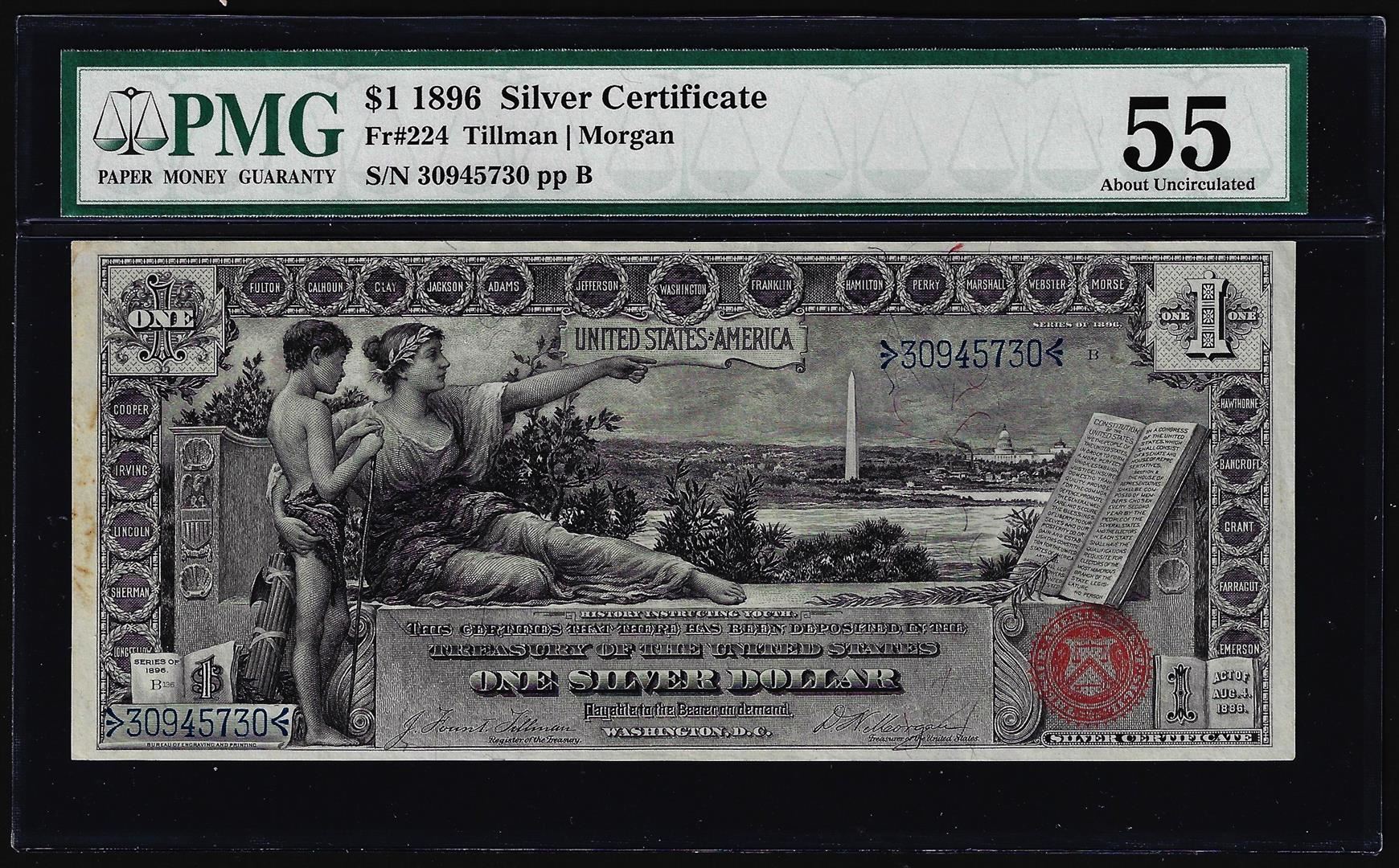 One 1896 $1 Educational Silver Certificate Note Fr.224 PMG About Uncirculated 55. PMG Certified.