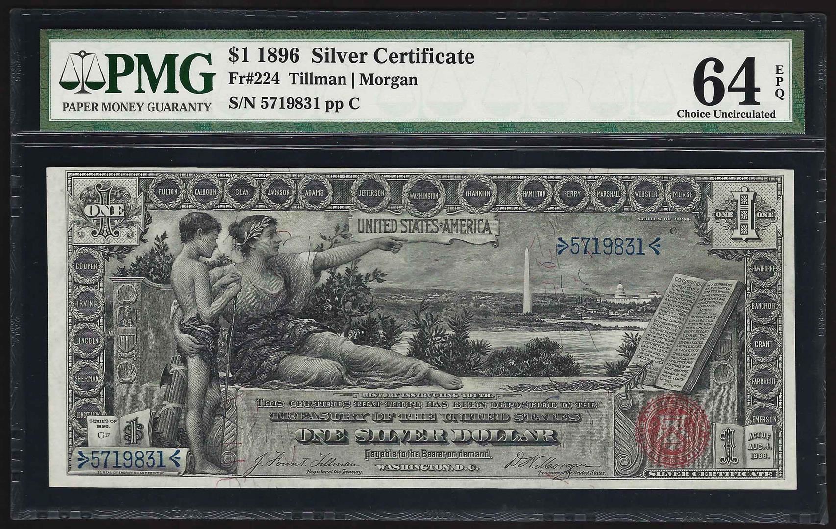 One 1896 $1 Educational Silver Certificate Note Fr.224 PMG Choice Uncirculated 64EPQ. PMG Certified.
