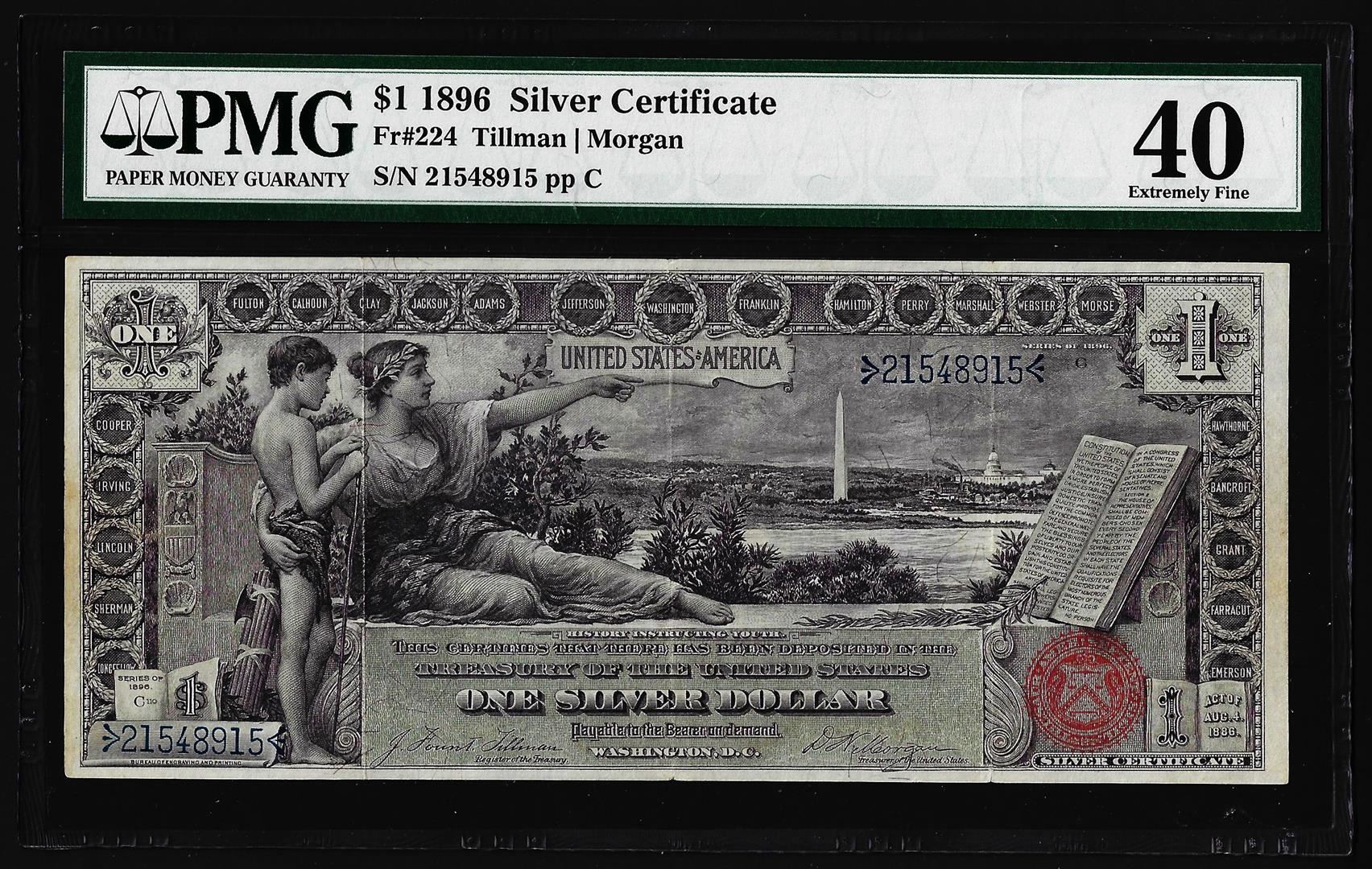One 1896 $1 Educational Silver Certificate Note Fr.224 PMG Extremely Fine 40. PMG Certified.