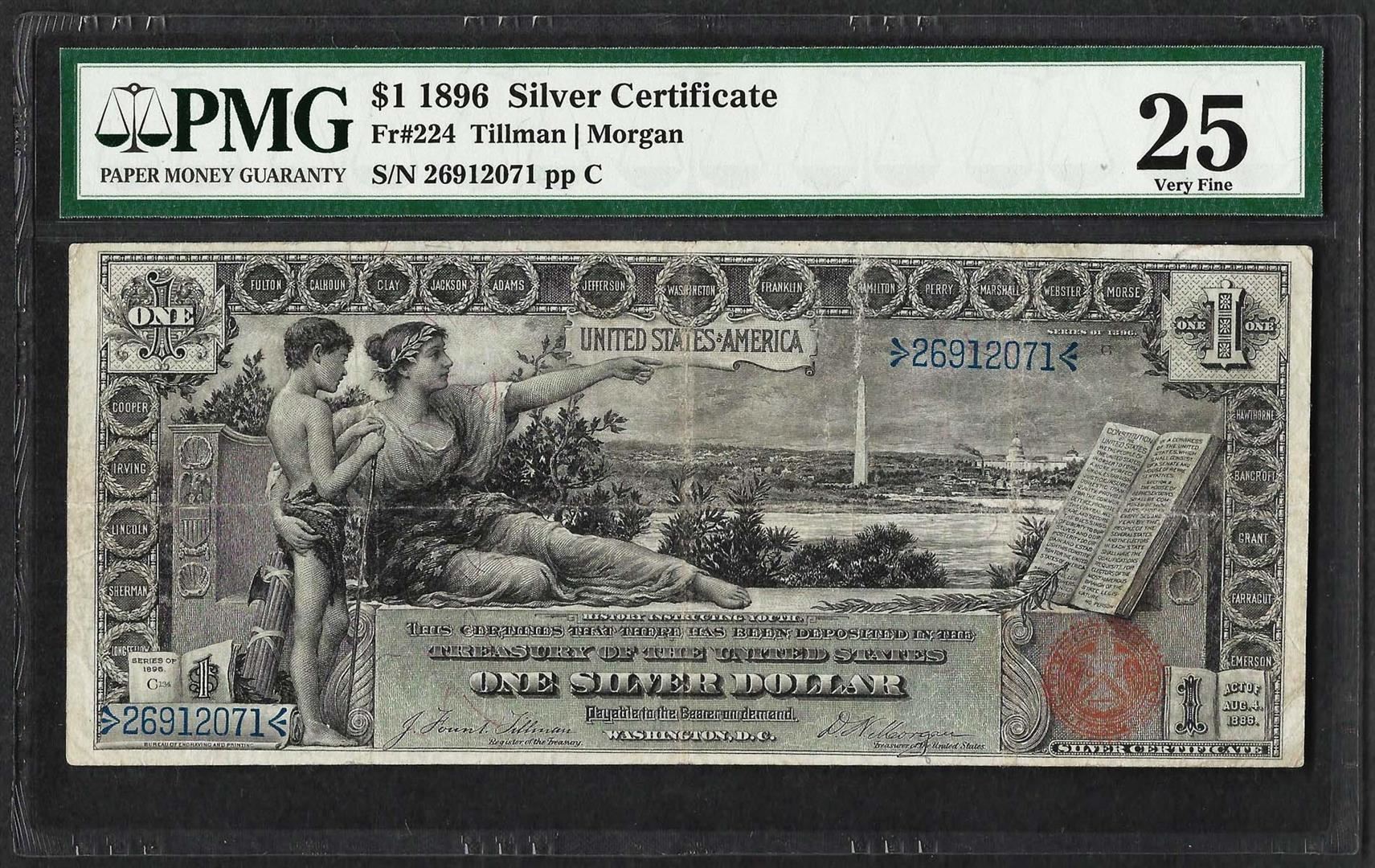 One 1896 $1 Educational Silver Certificate Note Fr.224 PMG Very Fine 25. PMG Certified.