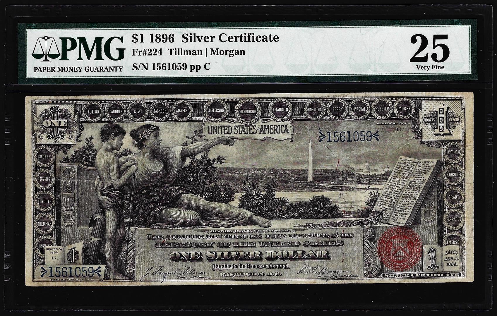One 1896 $1 Educational Silver Certificate Note Fr.224 PMG Very Fine 25. PMG Certified.