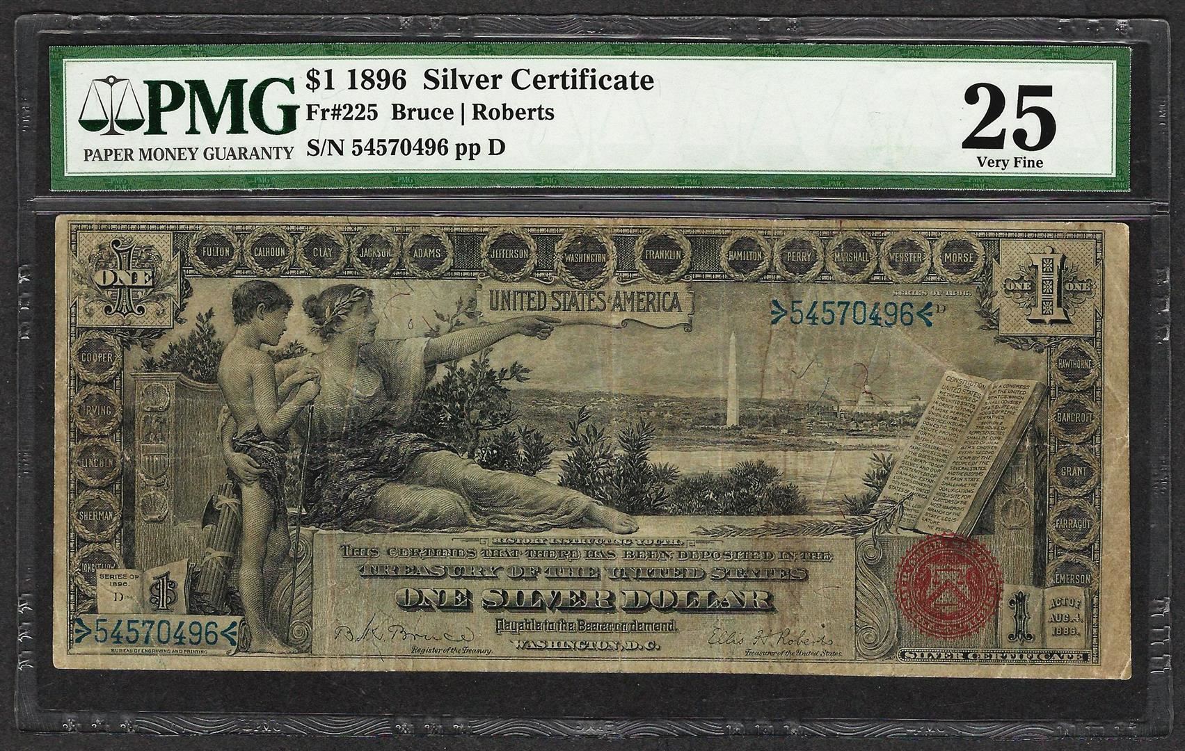 One 1896 $1 Educational Silver Certificate Note Fr.225 PMG Very Fine 25. PMG Certified.