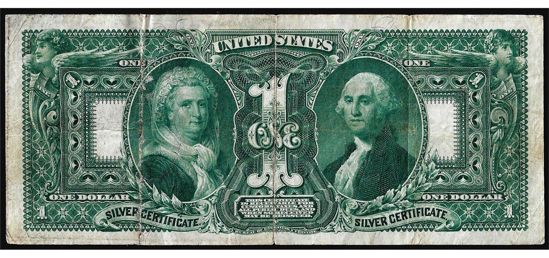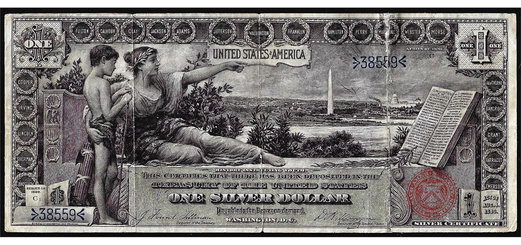 One 1896 $1 Educational Silver Certificate Note, the note does have a repaired tear as seen on the right hand side of the obverse of the note.