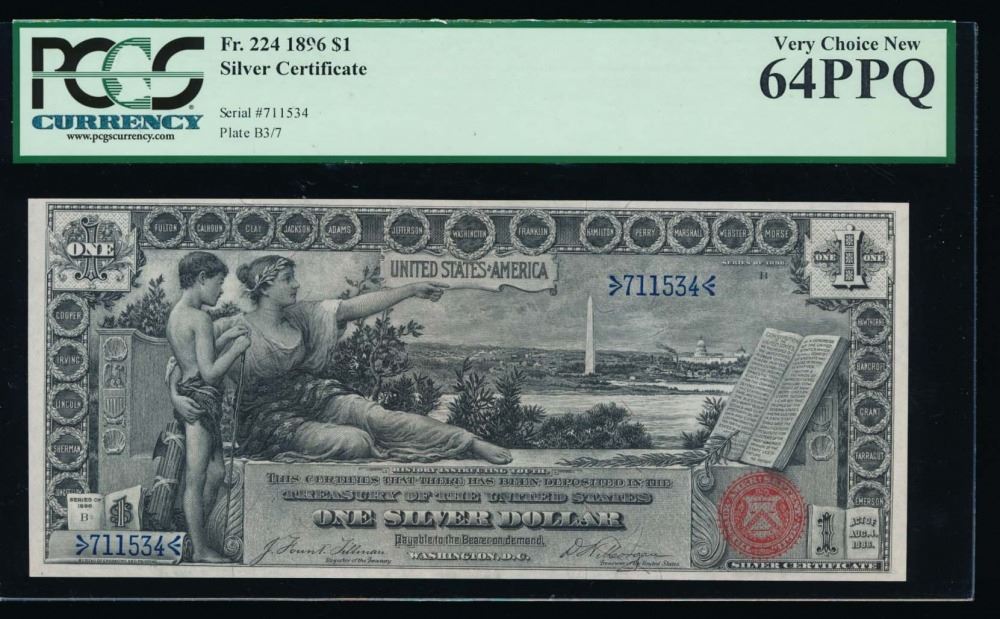 One 1896 $1 Educational Silver Certificate PCGS 64PPQ.