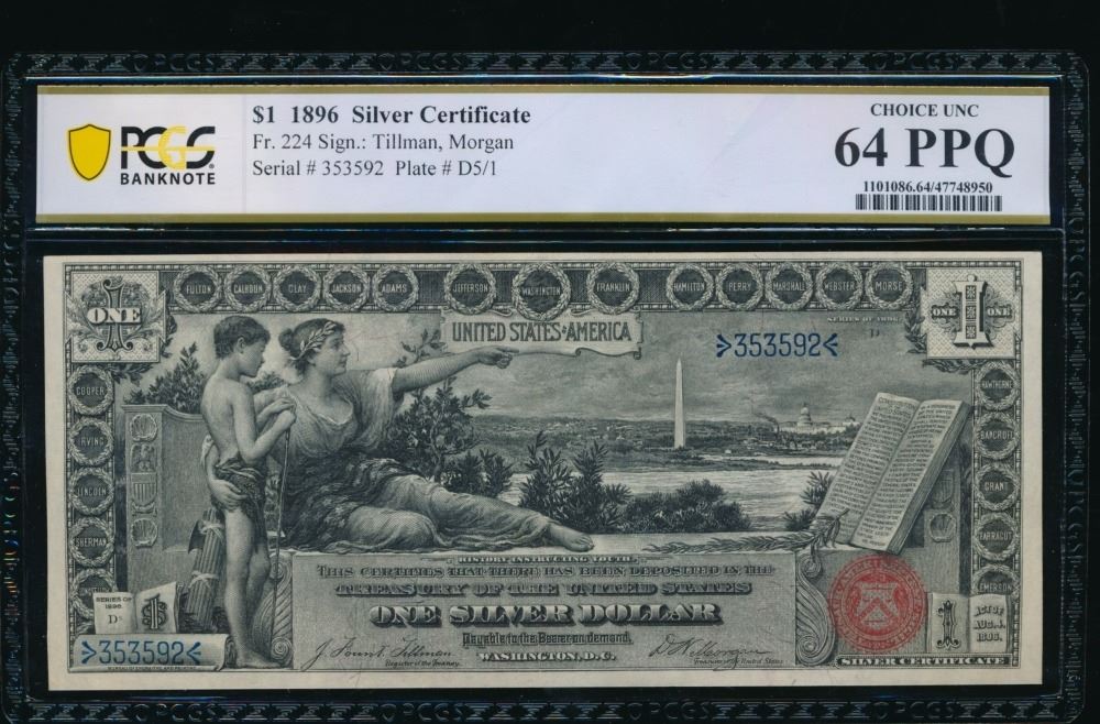 One 1896 $1 Educational Silver Certificate PCGS 64PPQ.