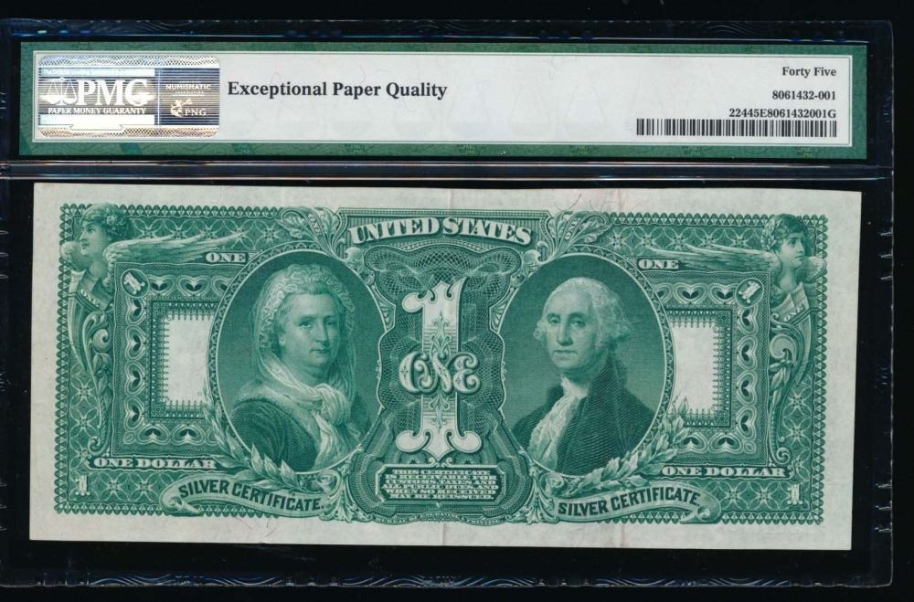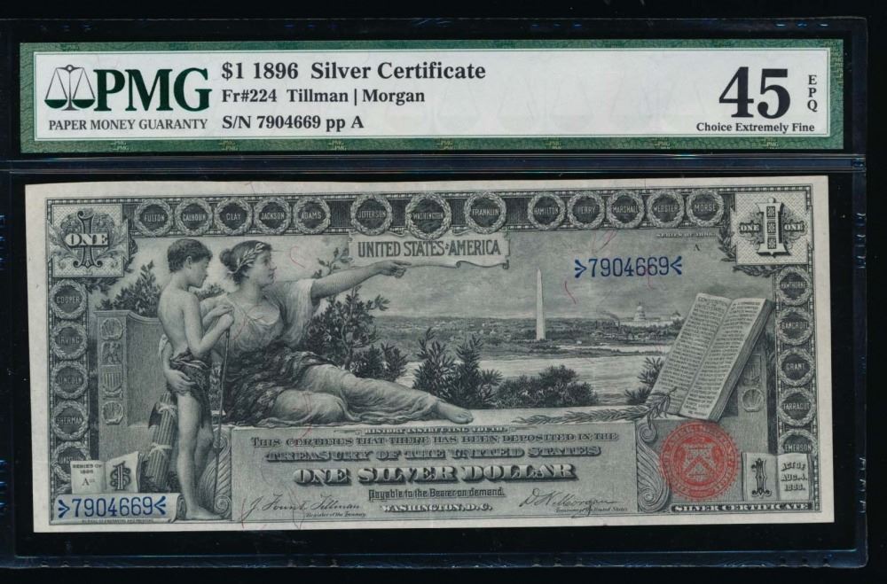 One 1896 $1 Educational Silver Certificate PMG 45EPQ.