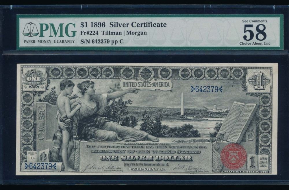 One 1896 $1 Educational Silver Certificate PMG 58.