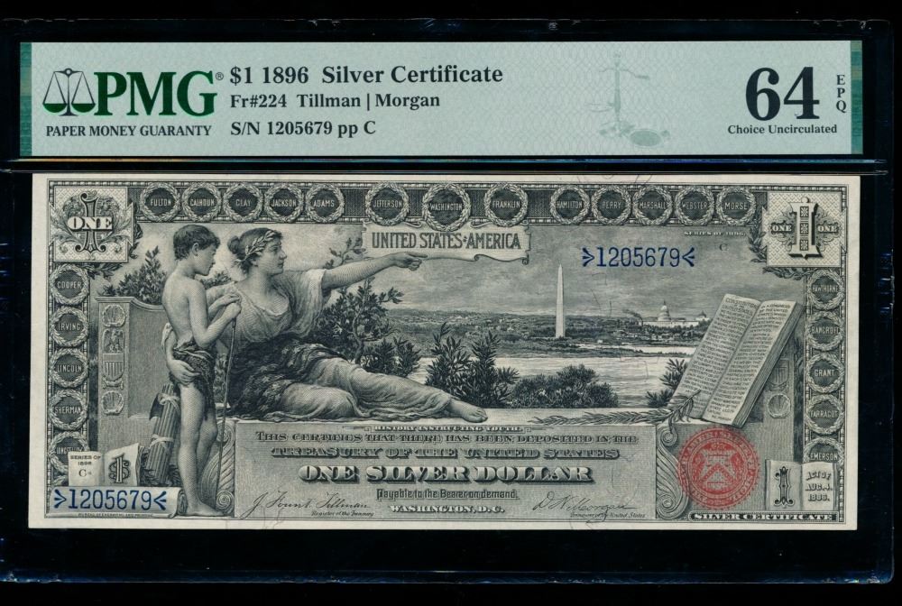 One 1896 $1 Educational Silver Certificate PMG 64EPQ.