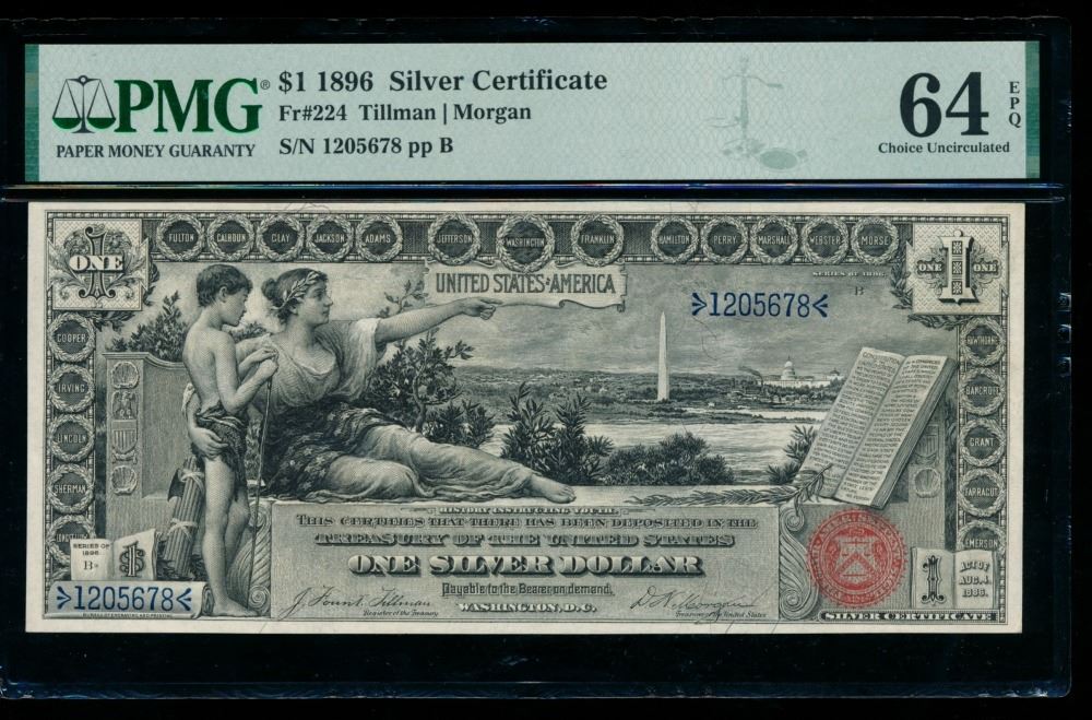 One 1896 $1 Educational Silver Certificate PMG 64EPQ.