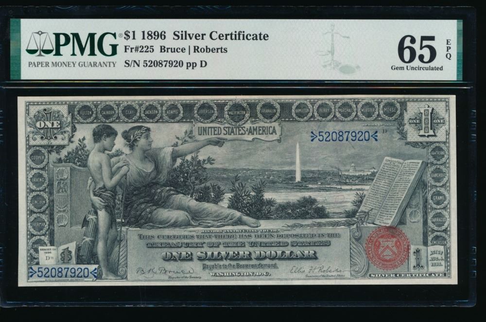 One 1896 $1 Educational Silver Certificate PMG 65EPQ.