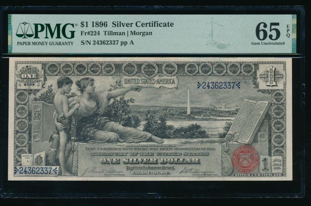 One 1896 $1 Educational Silver Certificate PMG 65EPQ.