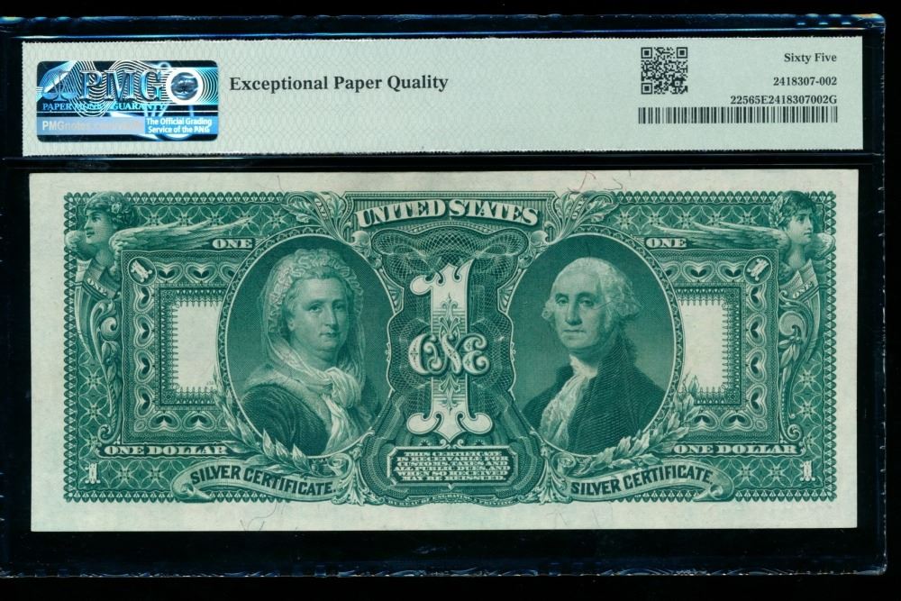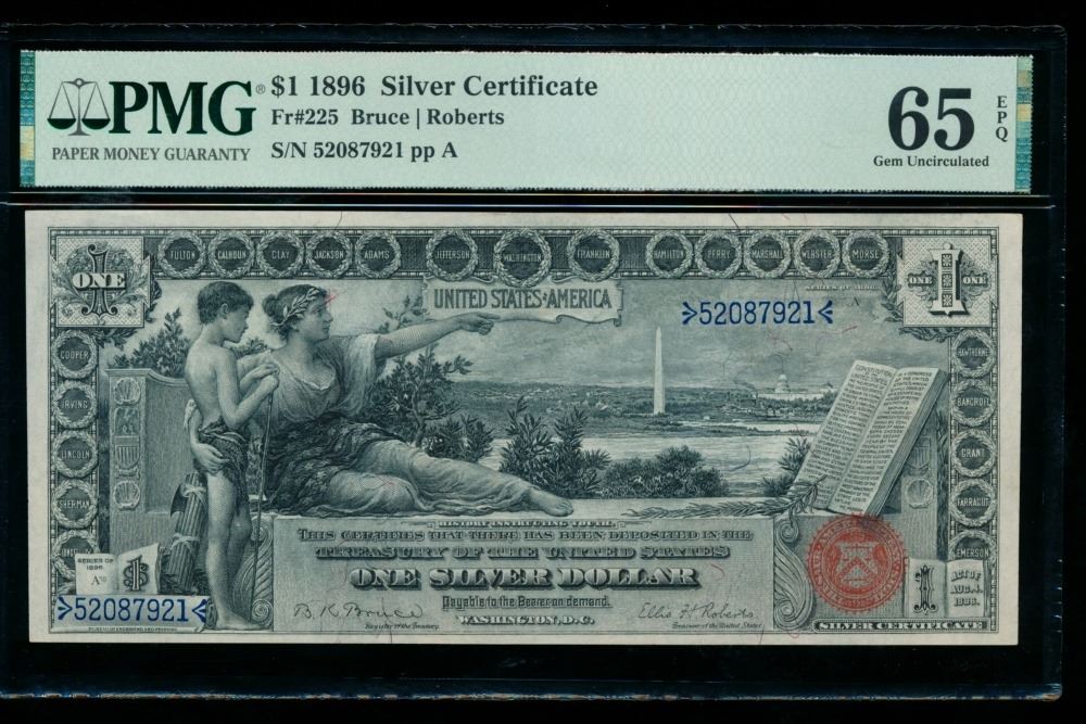 One 1896 $1 Educational Silver Certificate PMG 65EPQ.