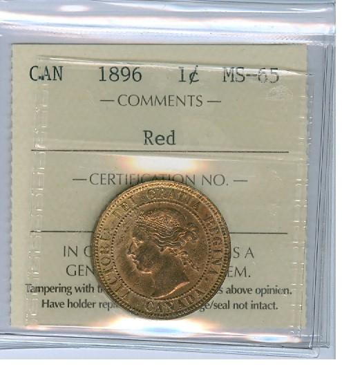 1896 1¢ ICCS MS65 Red. Full red! Excellent strike with clean fields and great surfaces. Tied for finest.