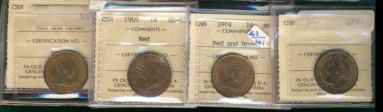 1896 1¢ MS60, 1904 & 1905 MS63RD and RB respectively along with 1908 MS62RB. Lot of 4 coins all ICCS graded.