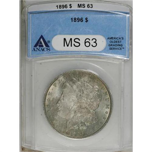 <B>1896 $1 MS63 ANACS.</B></I> NGC Census: (5529/14678). PCGS Population (6532/11831). Mintage: 9,976,762. Numismedia Wsl. Price for NGC/PCGS coin in MS63: $40. (#7240)<BR><BR><B>Coin Engraver:</B> George T. Morgan<BR><BR><b>Shipping:</b> Coins & Currency (<a target="_blank" href="http://www.heritageauctions.com/common/shipping.php">view shipping information</a>)
