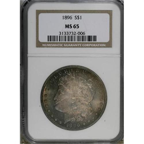 <B>1896 $1 MS65 NGC.</B></I> NGC Census: (3472/588). PCGS Population (2844/627). Mintage: 9,976,762. Numismedia Wsl. Price for NGC/PCGS coin in MS65: $135. (#7240)<BR><BR><B>Coin Engraver:</B> George T. Morgan<BR><BR><b>Shipping:</b> Coins & Currency (<a target="_blank" href="http://www.heritageauctions.com/common/shipping.php">view shipping information</a>)