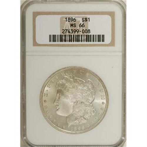 <B>1896 $1 MS66 NGC.</B></I> NGC Census: (513/42). PCGS Population (542/22). Mintage: 9,976,762. Numismedia Wsl. Price for NGC/PCGS coin in MS66: $460. (#7240)<BR><BR><b>Shipping:</b> Coins & Currency (<a target="_blank" href="http://www.heritageauctions.com/common/shipping.php">view shipping information</a>)