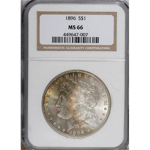 <B>1896 $1 MS66 NGC.</B></I> NGC Census: (515/42). PCGS Population (542/22). Mintage: 9,976,762. Numismedia Wsl. Price for NGC/PCGS coin in MS66: $460. (#7240)<BR><BR><b>Shipping:</b> Coins & Currency (<a target="_blank" href="http://www.heritageauctions.com/common/shipping.php">view shipping information</a>)